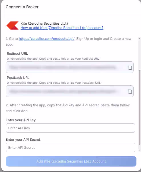 After clicking the “Add Zerodha Securities Ltd Account” button, you will be redirected to the Zerodha web login page, where you will be asked to enter your login credentials. Once the authentication is complete, you will be redirected back to your UtradeAlgos account. Your Zerodha account will now be successfully linked with UtradeAlgos and will appear under the Connected section in Manage Broker.