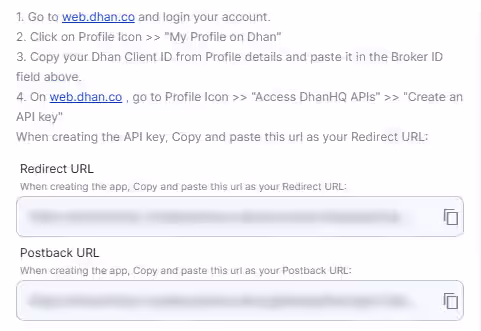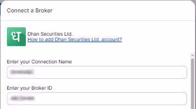 After clicking the “Add Dhan Securities Ltd Account” button, you will be redirected to the Dhan web login page, where you will be asked to enter your login credentials. Once the authentication is complete, you will be redirected back to your UtradeAlgos account. Your Dhan account will now be successfully linked with UtradeAlgos and will appear under the Connected section in Manage Broker. `